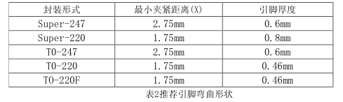 弯脚时绝对不要固定或夹紧塑料封装体,因为这样很可能破坏器件引脚与塑料封装体的结合部位。为了减小弯脚时对器件产生的应力,应在离器件封装体一定距离处夹紧引脚,一般来说,夹的地方离器件封装体越远,弯脚时器件越安全。对不同的封装,夹紧距离是不一样的,表2 为您提供了几种常用的可控硅器件封装的最小夹紧距离。